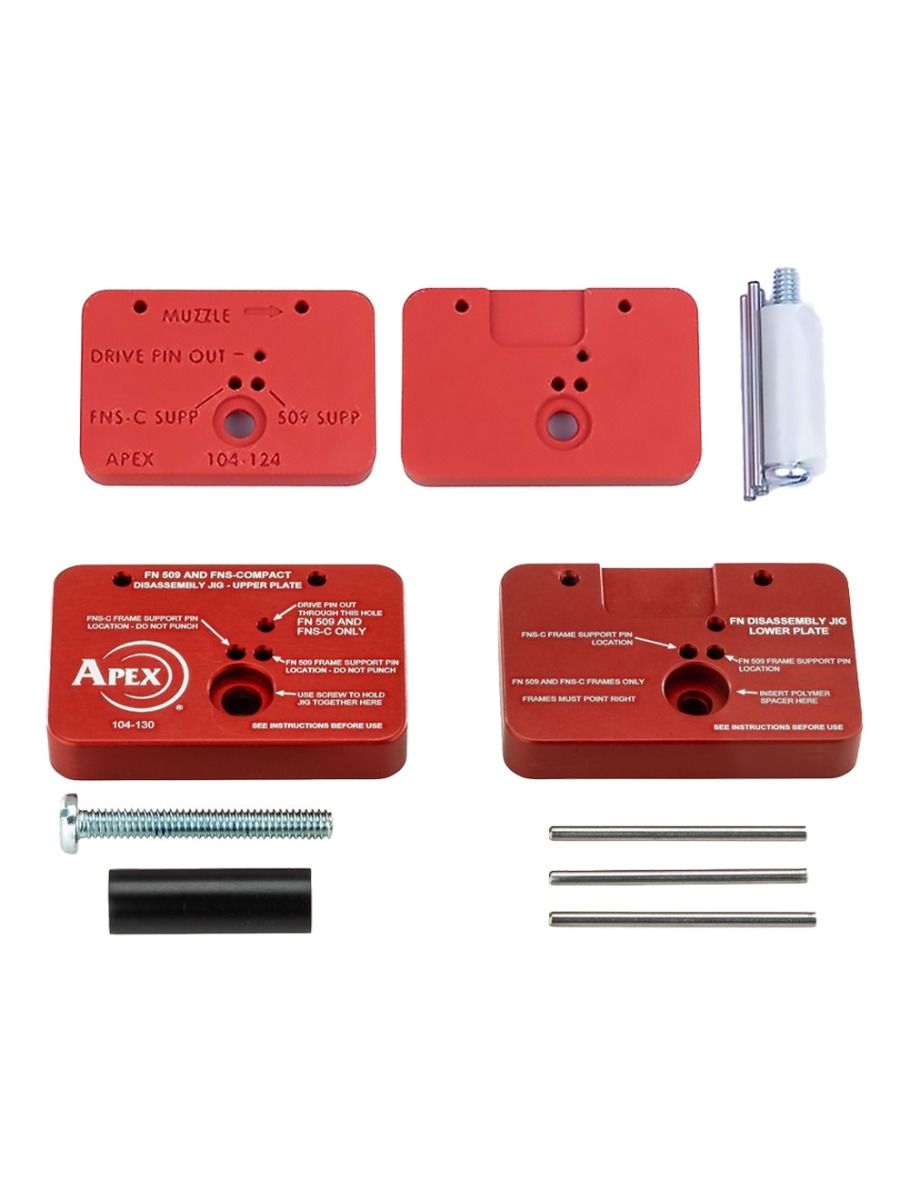 Working on an FN 509? Then this is likely the most valuable tool you could add to your workbench. The Apex FN Disassembly Fixture is designed to properly hold the FN 509, or FNS Compact, pistol frame to locate a pin punch for removal of the unlocking block pin, which is the most difficult part of th